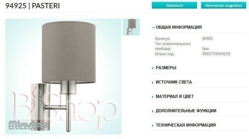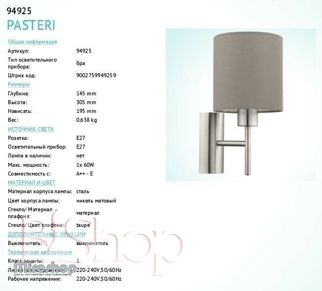 Кількість ламп: 1. Тип цоколя: E27. Висота (див): 30.5. Глибина (див): 19.5. Потужність лампи (Вт): 60. Діаметр (див): 14.5.