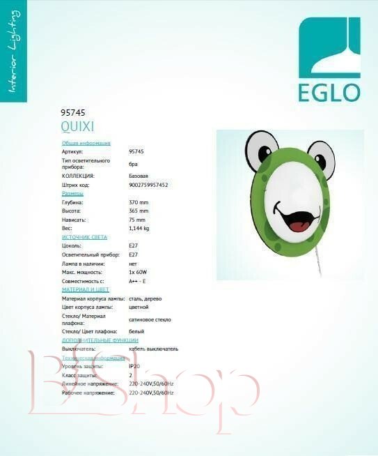 Кількість ламп: 1. Тип цоколя: E27. Висота (див): 36.5. Ширина (див): 37. Глибина (див): 7.5. Потужність лампи (Вт): 60.