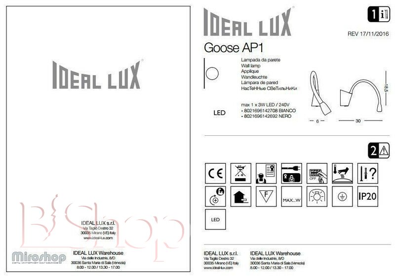 Бра Ideal Lux GOOSE AP1 BIANCO (142708) (93744)