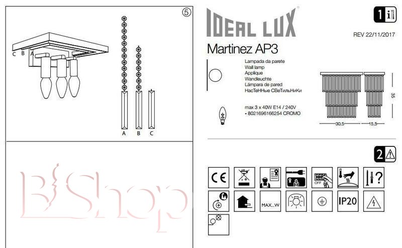 Кількість ламп: 3. Тип цоколя: E14. Висота (см): 35. Ширина (див): 30.5. Глибина (див): 15.5. Потужність лампи (Вт): 40.