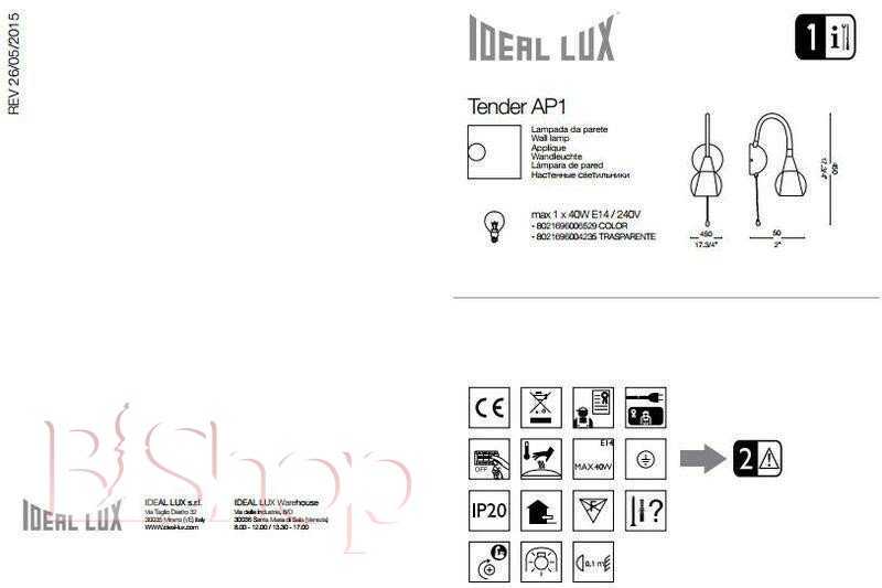 Кількість ламп: 1. Тип цоколя: E14. Висота (см): 45. Потужність лампи (Вт): 40. Довжина (див): 45.
