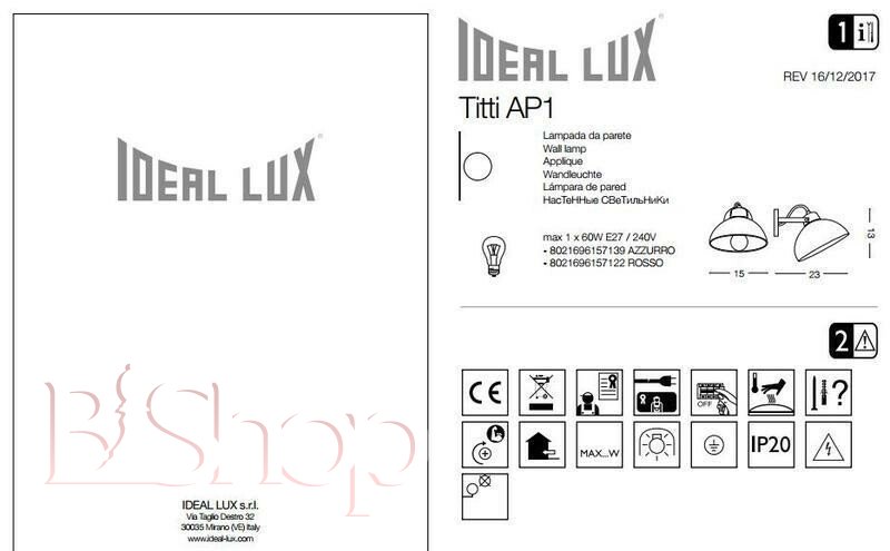 Кількість ламп: 1. Тип цоколя: E27. Висота (див): 13. Ширина (див): 15. Глибина (див): 23. Потужність лампи (Вт): 60.