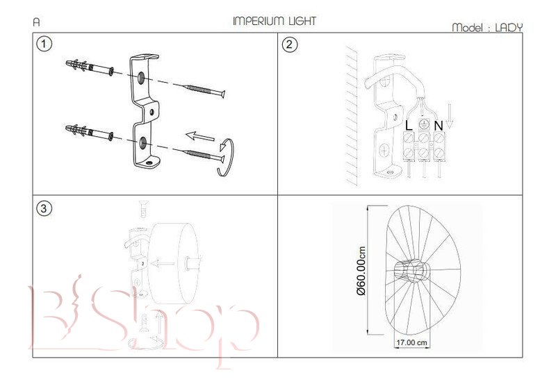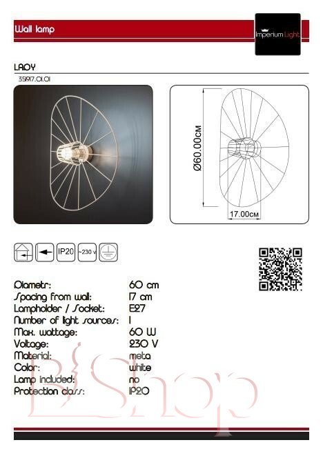 Кількість ламп: 1. Тип цоколя: E27. Глибина (див): 17. Потужність лампи (Вт): 60. Діаметр (див): 60.