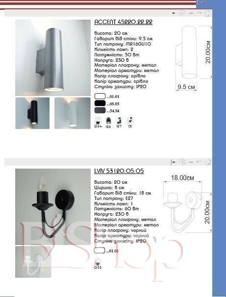 Кількість ламп: 2. Тип цоколя: GU10. Висота (див): 20. Глибина (див): 9.5. Потужність лампи (Вт): 50.