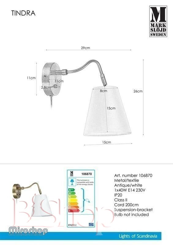 Кількість ламп: 1. Тип цоколя: E14. Висота (див): 27.5. Ширина (див): 15. Потужність лампи (Вт): 40. Довжина (див): 23.5.