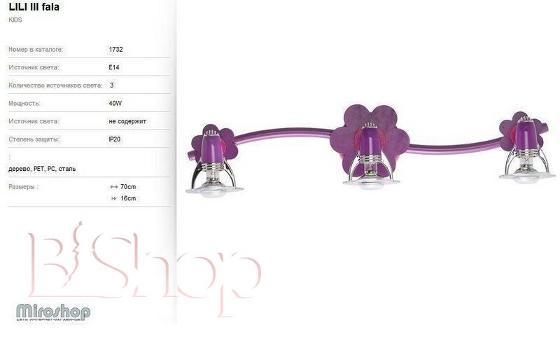 Кількість ламп: 3. Тип цоколя: E14. Ширина (див): 70. Глибина (див): 16. Потужність лампи (Вт): 40.