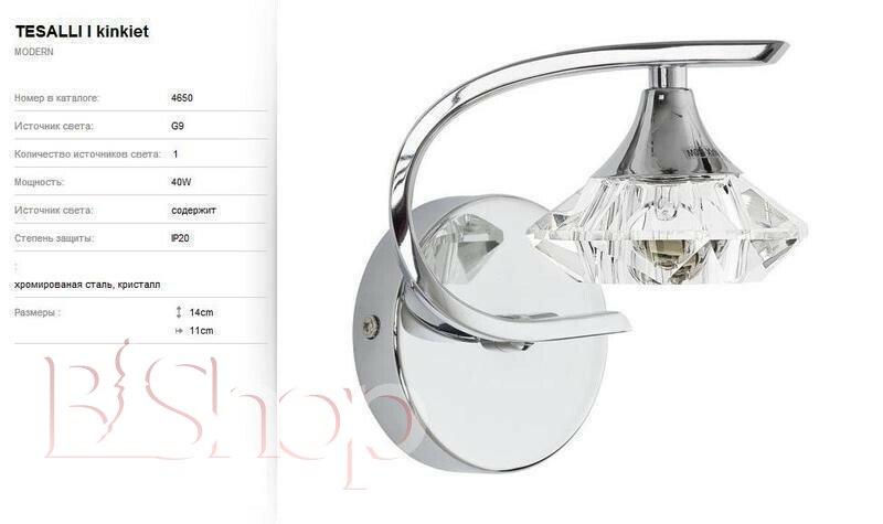 Кількість ламп: 1. Тип цоколя: G9. Висота (див): 14. Глибина (див): 11. Потужність лампи (Вт): 40.