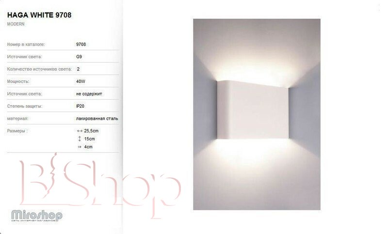 Кількість ламп: 2. Тип цоколя: G9. Висота (див): 15. Ширина (див): 25.5. Глибина (див): 4. Потужність лампи (Вт): 40.