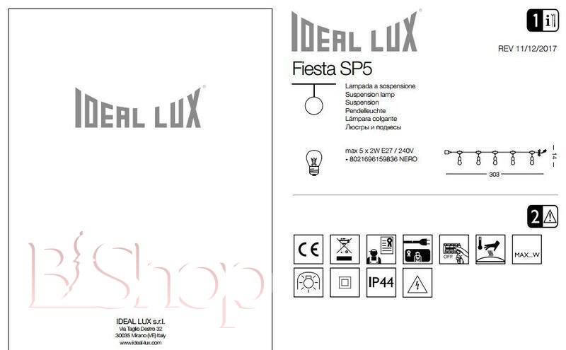 Кількість ламп: 5. Тип цоколя: E27. Висота (див): 14. Потужність лампи (Вт): 2. Діаметр (див): 4. Довжина (див): 303.