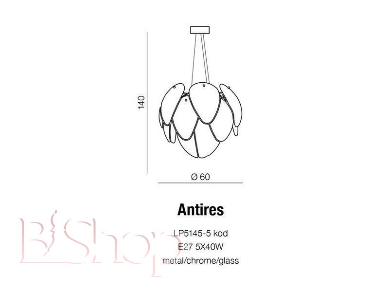 Кількість ламп: 5. Тип цоколя: E27. Висота (див): 140. Потужність лампи (Вт): 40. Діаметр (див): 60.