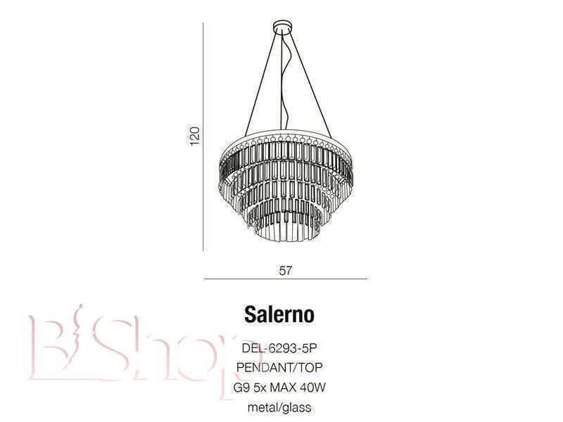 Кількість ламп: 5. Тип цоколя: E14. Висота (див): 120. Потужність лампи (Вт): 40. Діаметр (див): 57.