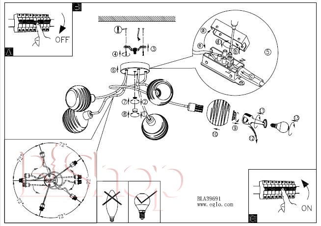 Кількість ламп: 5. Тип цоколя: E27. Висота (см): 24.5. Потужність лампи (Вт): 40. Діаметр (див): 69.5.