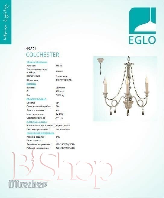Кількість ламп: 3. Тип цоколя: E14. Висота (див): 110. Потужність лампи (Вт): 40. Діаметр (див): 58.