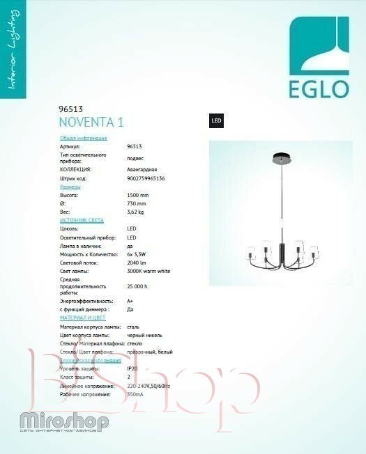 Кількість ламп: 6. Тип цоколя: LED. Висота (див): 150. Потужність лампи (Вт): 3.3. Діаметр (див): 73.