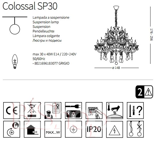 Кількість ламп: 20 і більш. Тип цоколя: E14. Висота (див): 256. Потужність лампи (Вт): 40.