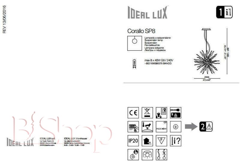 Кількість ламп: 8. Тип цоколя: G9. Висота (див): 130. Потужність лампи (Вт): 40. Діаметр (див): 50.