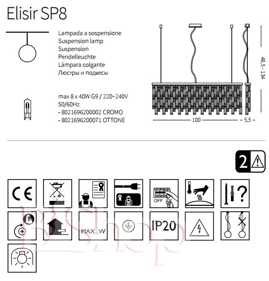 Кількість ламп: 8. Тип цоколя: G9. Висота (див): 134. Ширина (див): 5.5. Потужність лампи (Вт): 40. Довжина (див): 100.