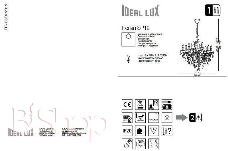 Кількість ламп: 12. Тип цоколя: E14. Висота (див): 120. Потужність лампи (Вт): 40. Діаметр (див): 72.