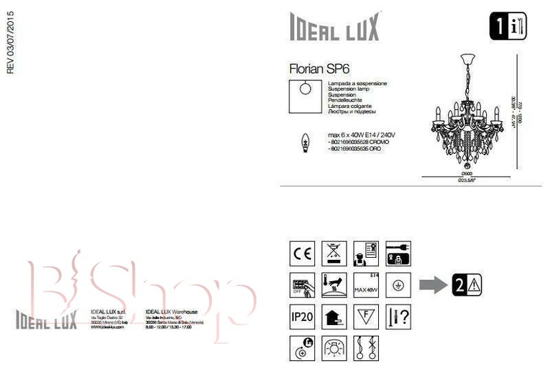 Кількість ламп: 6. Тип цоколя: E14. Висота (див): 120. Потужність лампи (Вт): 40. Діаметр (див): 60.
