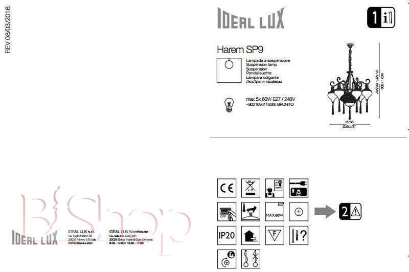 Кількість ламп: 9. Тип цоколя: E27. Висота (див): 170. Потужність лампи (Вт): 60. Діаметр (див): 75.