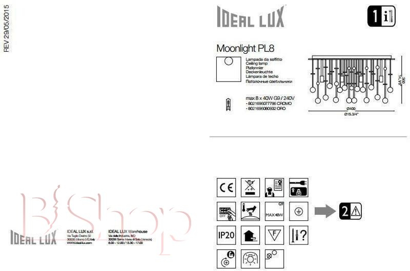 Кількість ламп: 8. Тип цоколя: G9. Висота (див): 36. Потужність лампи (Вт): 40. Діаметр (див): 40.