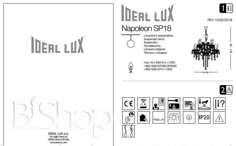 Кількість ламп: 18. Тип цоколя: E14. Висота (див): 170. Потужність лампи (Вт): 40. Діаметр (див): 94.