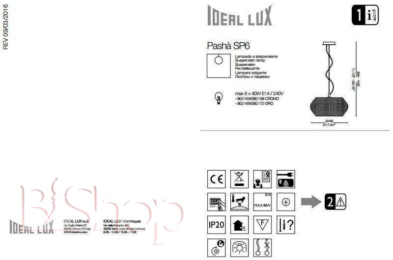 Люстра Ideal Lux PASHA SP6 ORO (082172)
