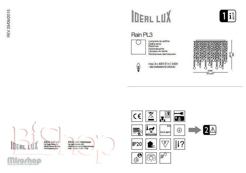 Кількість ламп: 3. Тип цоколя: E14. Висота (див): 36. Ширина (див): 14. Потужність лампи (Вт): 40. Довжина (див): 40.