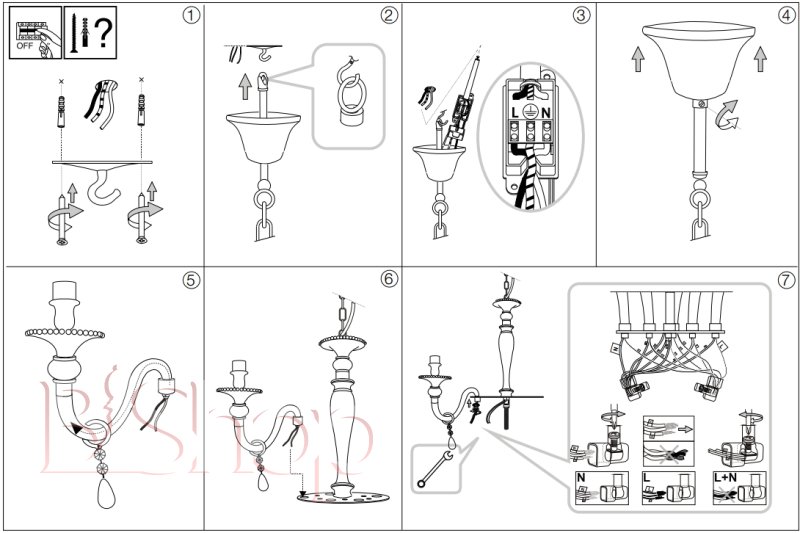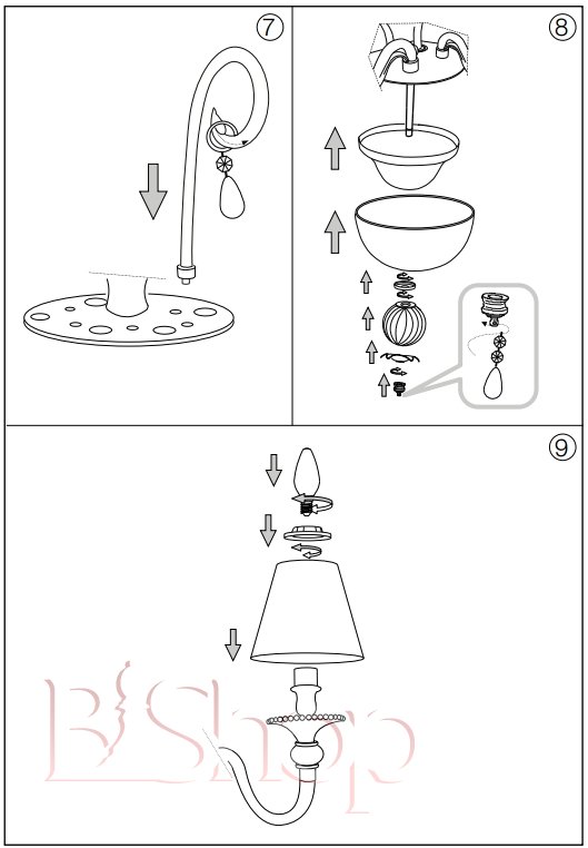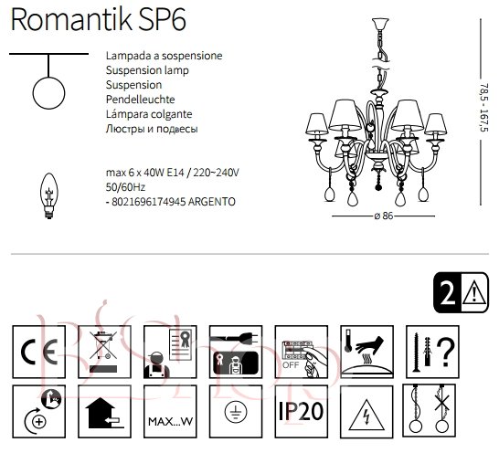 Кількість ламп: 6. Тип цоколя: E14. Висота (див): 167.5. Ширина (див): 86. Потужність лампи (Вт): 40.