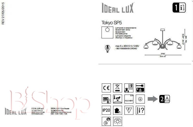 Кількість ламп: 5. Тип цоколя: E14. Висота (див): 75. Потужність лампи (Вт): 40. Діаметр (див): 75.