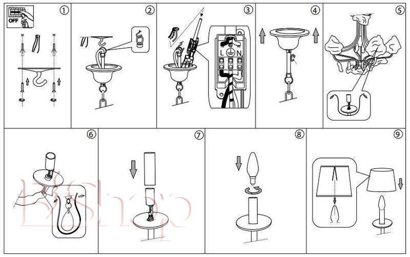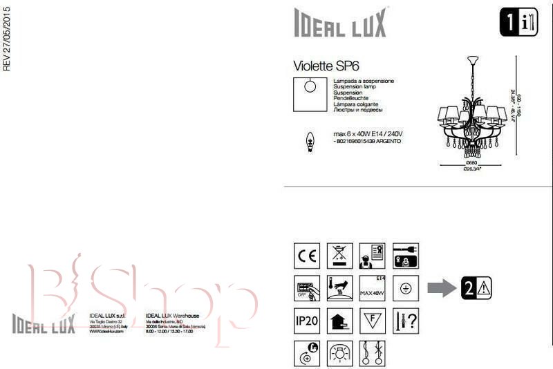 Кількість ламп: 6. Тип цоколя: E14. Висота (див): 115. Потужність лампи (Вт): 40. Діаметр (див): 68.