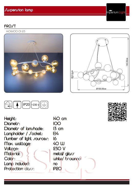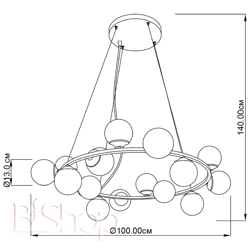 Кількість ламп: 16. Тип цоколя: E14. Висота (див): 140. Ширина (див): 100. Потужність лампи (Вт): 40.