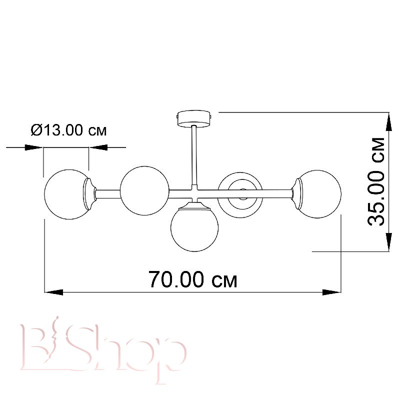 Кількість ламп: 5. Тип цоколя: E14. Висота (див): 35. Потужність лампи (Вт): 40. Довжина (див): 70.