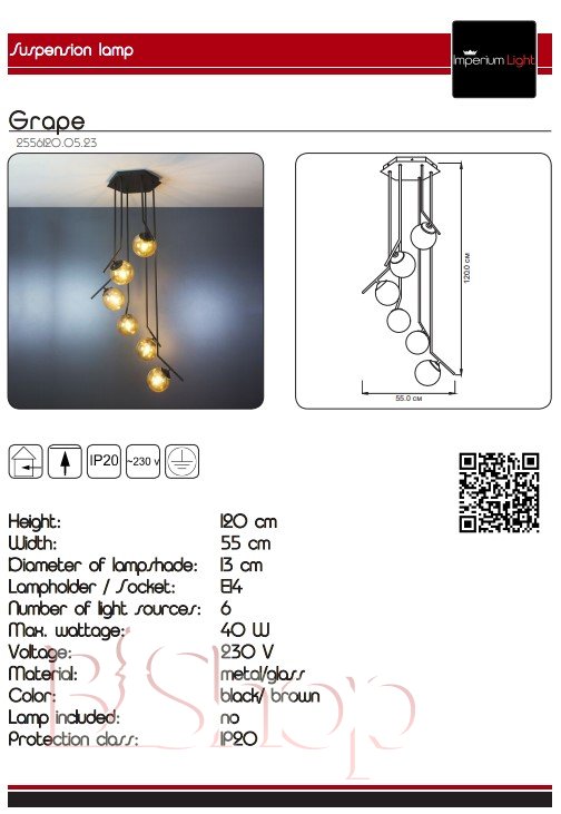 Кількість ламп: 6. Тип цоколя: E14. Висота (див): 120. Ширина (див): 55. Потужність лампи (Вт): 40.