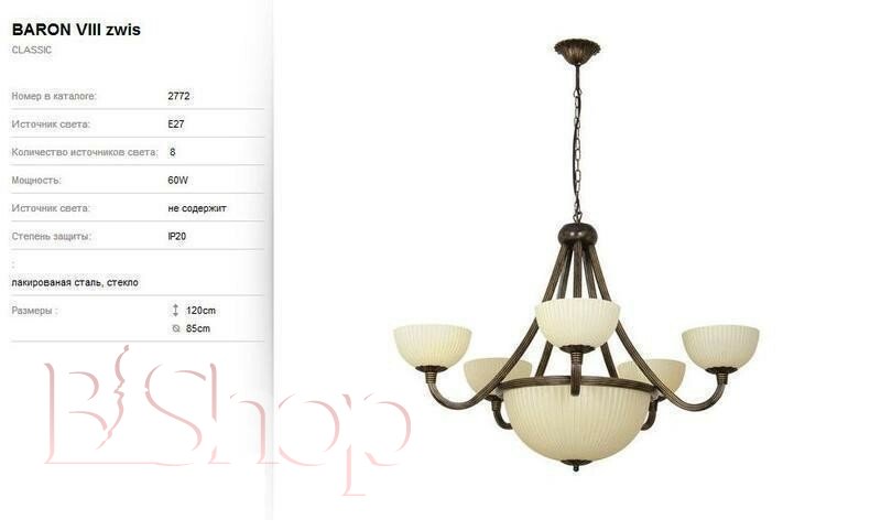 Кількість ламп: 8. Тип цоколя: E27. Висота (див): 120. Потужність лампи (Вт): 60. Діаметр (див): 85.