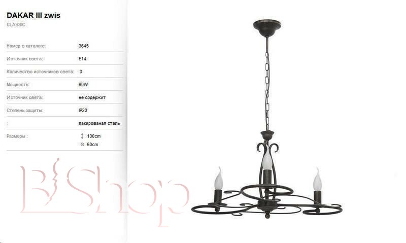 Кількість ламп: 3. Тип цоколя: E14. Висота (див): 100. Потужність лампи (Вт): 60. Діаметр (див): 60.