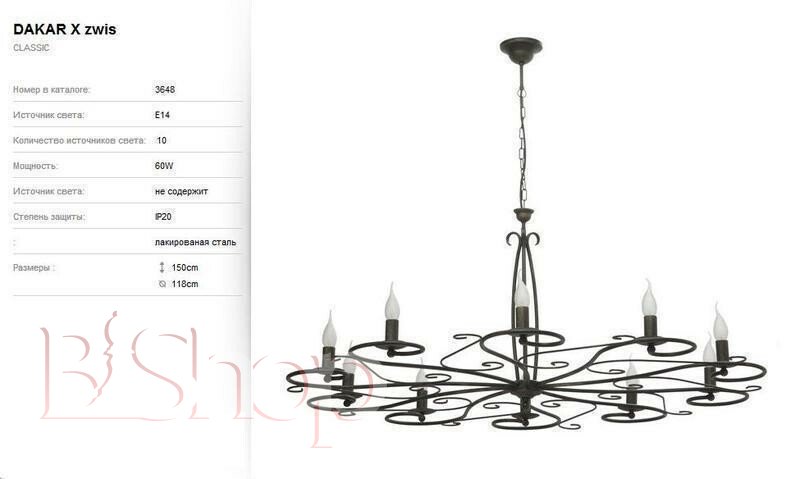 Кількість ламп: 10. Тип цоколя: E14. Висота (див): 150. Потужність лампи (Вт): 60. Діаметр (див): 118.