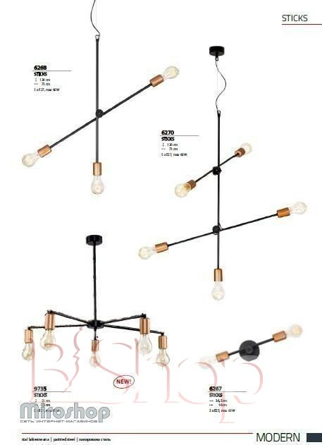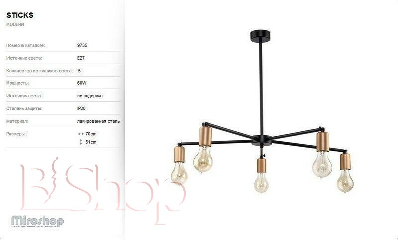 Кількість ламп: 5. Тип цоколя: E27. Висота (див): 51. Потужність лампи (Вт): 60. Діаметр (див): 70.