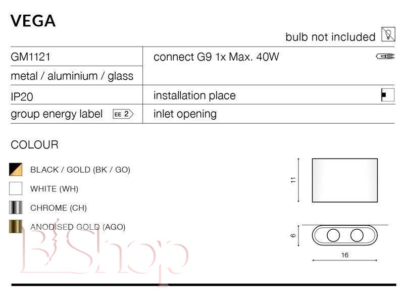 Кількість ламп: 1. Тип цоколя: G9. Висота (див): 11. Ширина (див): 16. Глибина (див): 6. Потужність лампи (Вт): 40.