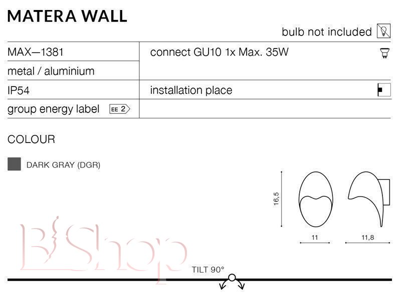 Кількість ламп: 1. Тип цоколя: GU10. Висота (див): 16. Ширина (см): 11. Глибина (див): 12. Потужність лампи (Вт): 35.
