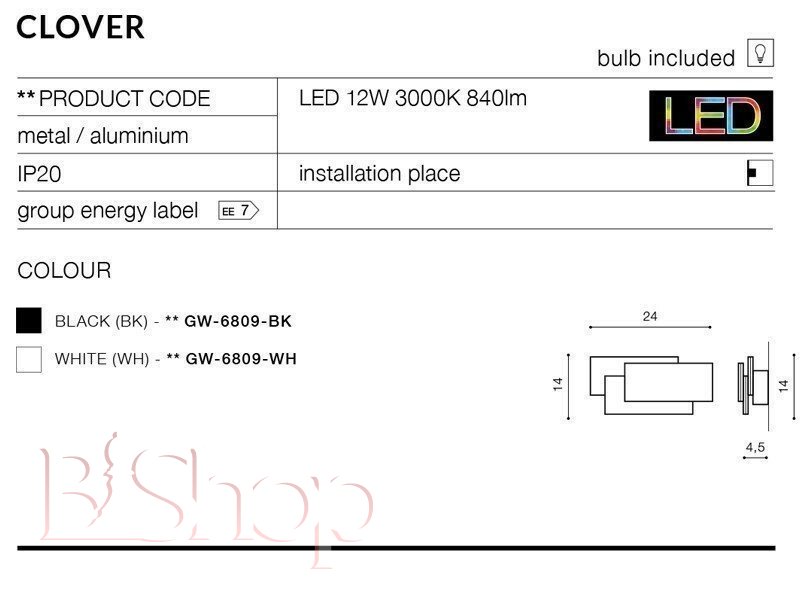 Кількість ламп: 1. Тип цоколя: LED. Висота (див): 14. Ширина (див): 24. Глибина (див): 4.5. Потужність лампи (Вт): 12.