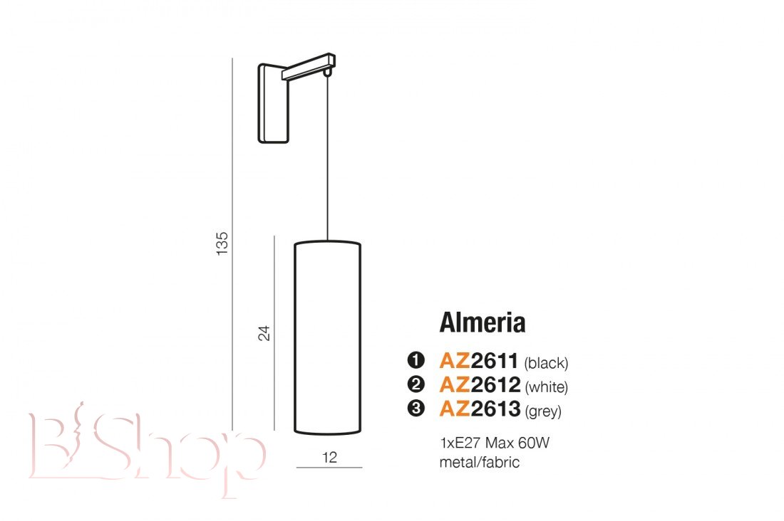 Кількість ламп: 1. Тип цоколя: E27. Висота (див): 135. Ширина (див): 12. Потужність лампи (Вт): 60.