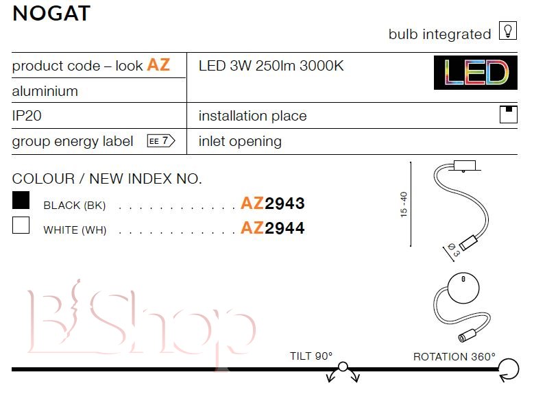 Кількість ламп: 1. Тип цоколя: LED. Глибина (див): 40. Потужність лампи (Вт): 3. Діаметр (див): 3.