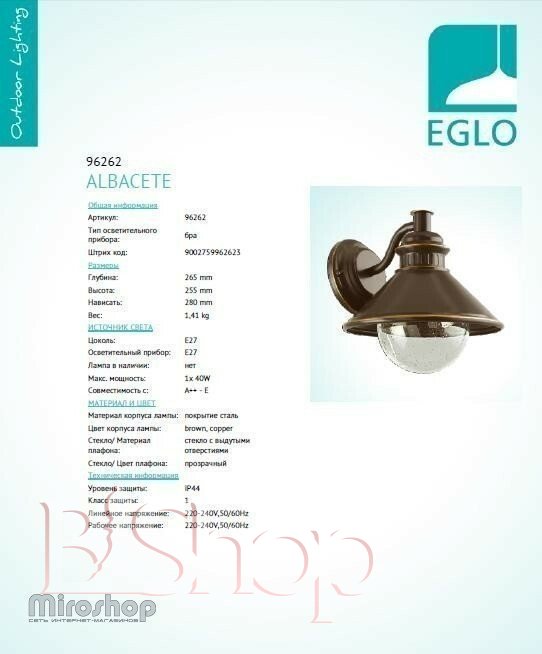 Кількість ламп: 1. Тип цоколя: E27. Висота (див): 25.5. Ширина (див): 26.5. Глибина (див): 28. Потужність лампи (Вт): 60.