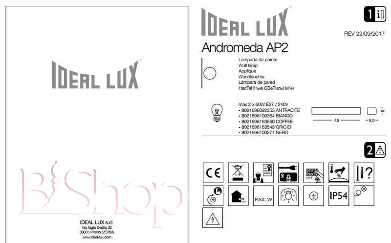 Кількість ламп: 2. Тип цоколя: E27. Висота (див): 8. Глибина (див): 9.5. Потужність лампи (Вт): 60. Довжина (див): 45.