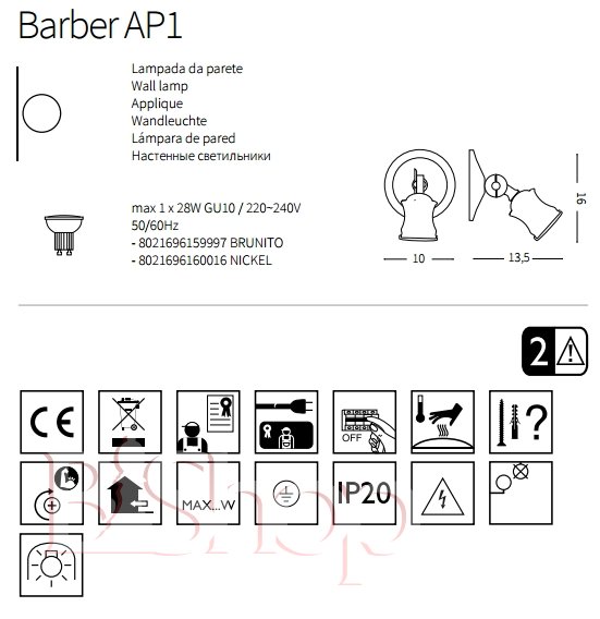 Кількість ламп: 1. Тип цоколя: GU10. Висота (див): 16. Ширина (див): 10. Глибина (див): 13. Потужність лампи (Вт): 28.