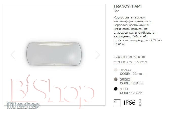 Настінний світильник Ideal Lux FRANCY-1 AP1 BIANCO (123745) (88110)