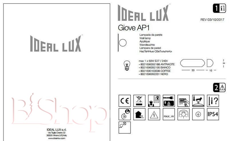 Кількість ламп: 1. Тип цоколя: E27. Висота (див): 8. Глибина (див): 10. Потужність лампи (Вт): 60. Довжина (див): 33.