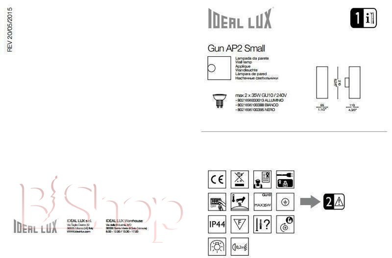 Настінний світильник Ideal Lux GUN AP2 SMALL NERO (100395) (81228)