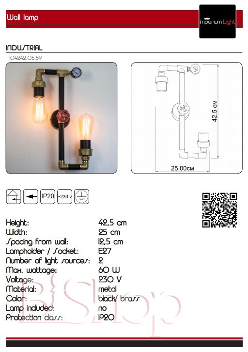 Кількість ламп: 2. Тип цоколя: E27. Висота (див): 42.5. Ширина (див): 25. Потужність лампи (Вт): 60.